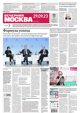 «Вечерняя Москва» — ежедневная российская вечерняя газета, старейшее из вечерних изданий в России, учрежденное в 1923 году. Выходит пять дней в неделю, кроме субботы и воскресенья. Отличается тем, что рассказывает о событиях еще не завершившегося дня. Оперативно освещает хронику и особенности жизни Москвы, охватывает все слои общества и большинство профессиональных и возрастных групп читателей.Издание представлено тремя выпусками – утренним ежедневным, вечерним (выходит три раза в неделю), еженедельным (выходит по четвергам).