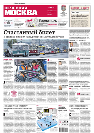 «Вечерняя Москва» — ежедневная российская вечерняя газета, старейшее из вечерних изданий в России, учрежденное в 1923 году. Выходит пять дней в неделю, кроме субботы и воскресенья. Отличается тем, что рассказывает о событиях еще не завершившегося дня. Оперативно освещает хронику и особенности жизни Москвы, охватывает все слои общества и большинство профессиональных и возрастных групп читателей.Издание представлено тремя выпусками – утренним ежедневным, вечерним (выходит три раза в неделю), еженедельным (выходит по четвергам).