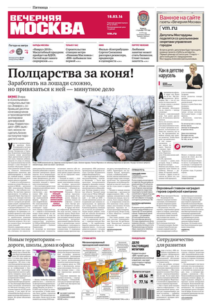 «Вечерняя Москва» — ежедневная российская вечерняя газета, старейшее из вечерних изданий в России, учрежденное в 1923 году. Выходит пять дней в неделю, кроме субботы и воскресенья. Отличается тем, что рассказывает о событиях еще не завершившегося дня. Оперативно освещает хронику и особенности жизни Москвы, охватывает все слои общества и большинство профессиональных и возрастных групп читателей.Издание представлено тремя выпусками – утренним ежедневным, вечерним (выходит три раза в неделю), еженедельным (выходит по четвергам).