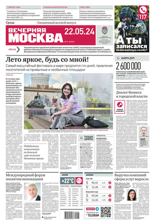 «Вечерняя Москва» — ежедневная российская вечерняя газета, старейшее из вечерних изданий в России, учрежденное в 1923 году. Выходит пять дней в неделю, кроме субботы и воскресенья. Отличается тем, что рассказывает о событиях еще не завершившегося дня. Оперативно освещает хронику и особенности жизни Москвы, охватывает все слои общества и большинство профессиональных и возрастных групп читателей.Издание представлено тремя выпусками – утренним ежедневным, вечерним (выходит три раза в неделю), еженедельным (выходит по четвергам).